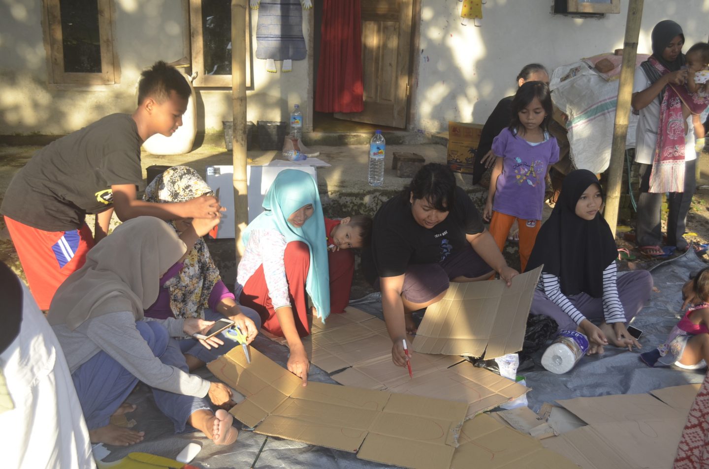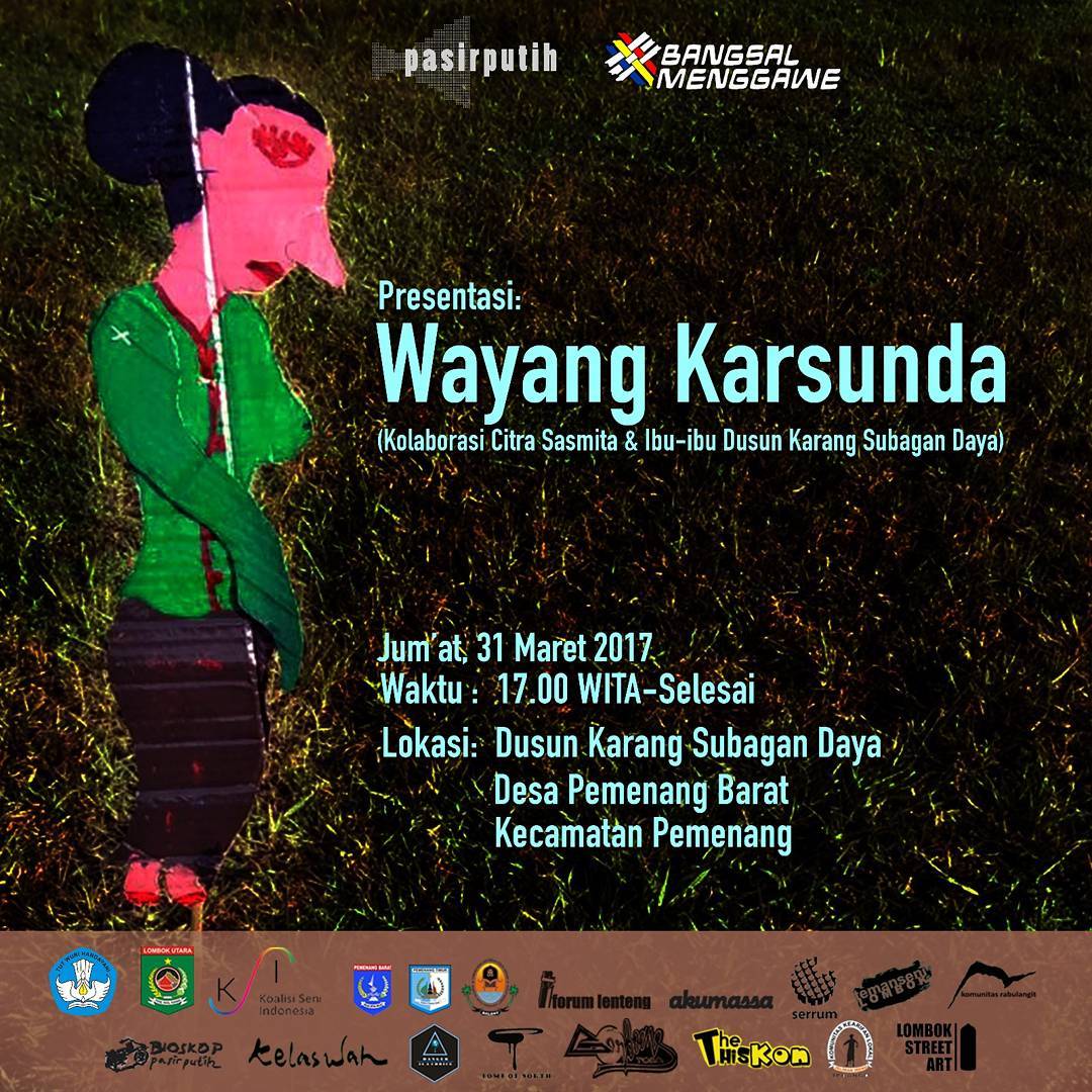 Akhirnya, ketika menjelang sore, saya beranjak menuju sebuah tanah lapang di sisi persawahan di dusun Karang Subagan Daya untuk menyaksikan presentasi oleh Citra Sasmita dan warga lokal di dusun tersebut. Mbak Citra, begitu saya menyapanya, sebagaimana komunitas Serrum, adalah salah satu seniman undangan yang mengikuti kegiatan “residensi seniman” yang difasilitasi oleh Pasirputih dalam rangka Bangsal Menggawe 2017 ini. “Residensi seniman” merupakan istilah umum yang digunakan untuk merujuk kegiatan-kegiatan yang mengundang seorang atau beberapa seniman untuk tinggal selama beberapa waktu di sebuah lokasi, untuk membuat karya atau proyek kesenian. Oleh Pasirputih, seniman-seniman yang diundang didorong untuk berkolaborasi dengan warga. Selama residensi, seniman-seniman ini melakukan pendekatan dengan masyarakat lokal di Kecamatan Pemenang, kemudian dengan masyarakat membuat suatu karya bersama-sama. Mbak Citra bersama perempuan-perempuan dan anak-anak di Karang Subagan Daya memutuskan untuk membuat proyek Wayang Karsunda (akronim dari “karang subagan daya”) sebagai representasi kehidupan masyarakat di dusun tersebut.