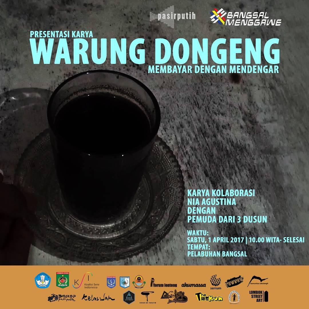 SAYA PRIBADI HARI, masih tanggal 1 April 2017, memang sangat penasaran dengan proyek seni “Warung Dongeng” karya Nia Agustina bersama warga dari tiga dusun (Tebango, Karang Pangsor, dan Karang Kauhan). Ketika mendengar warung, bayangan saya langsung penuh dengan barang dagangan dan interaksi jual-beli antara pedagang dan pembeli. Pertanyaan saya berlanjut, dongeng sejenis apa yang bisa diperjualbelikan? Tidak selesai di situ, saya khawatir dan bertanya-tanya, “Memangnya, siapa yang mau beli dongeng?” Karenanya, tingkat penasaran saya terhadap warung dongeng ini tidak bisa dibendung lagi.