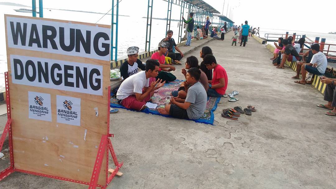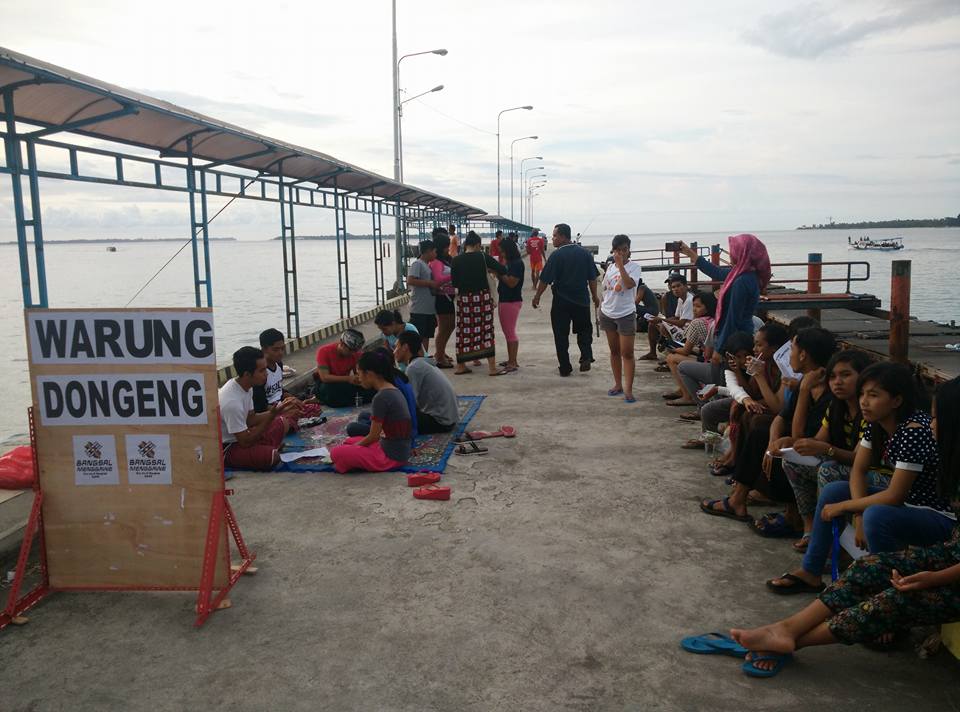 Saat tiba di lapak warung dongeng, yang berlokasi di dermaga Pelabuhan Bangsal—di titik lokasi yang menjadi tempat para pelancong menaiki boat menuju Tiga Gili atau Bali—saya melihat ada banyak anak yang sedang mengantri untuk membeli dongeng. Saya semakin penasaran dengan warung dongeng ini. Setelah memperhatikan lebih jauh, ternyata salah satu komunitas yang berkolaborasi dengan Mbak Nia adalah Komunitas Kearifan Lokal Tebango (K2LT). Warung Dongeng ini merupakan salah satu cara yang dilakukan oleh pemuda-pemudi di Pemenang untuk meningkatkan kesadaran terhadap sejarah dan mengabadikan narasi tentang keberagaman, agar tidak hilang ditelan zaman.