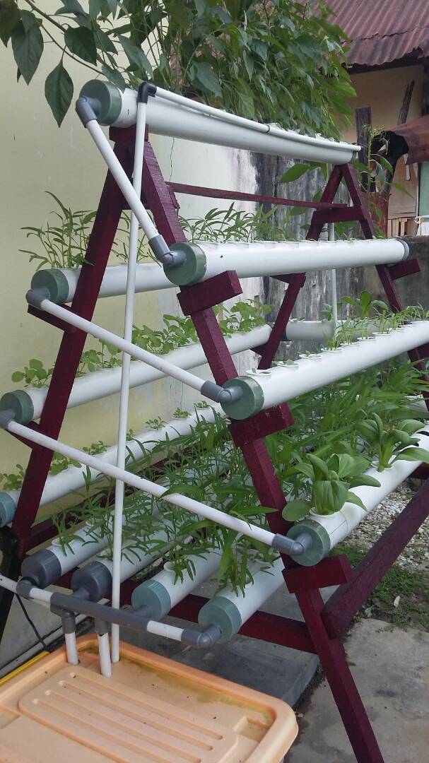 Sepulang dari Lombok bulan April lalu, saya melihat ada perbedaan di halaman rumah Pak Dayan. Di sana sudah ada instalasi hidroponik. Saat melihatnya pertama kali, instalasi hidroponik di rumah Pak Dayan penuh dengan sayuran kangkung, kemudian bayam, dan sekarang instalasi hidroponiknya penuh dengan berbagai macam sayuran, yaitu kangkung, bayam, pak coy, dan cabe. Sayuran-sayuran itu sudah memasuki musim tanam ketiga selama lebih kurang 4 bulan sejak memiliki instalasi hidroponik.