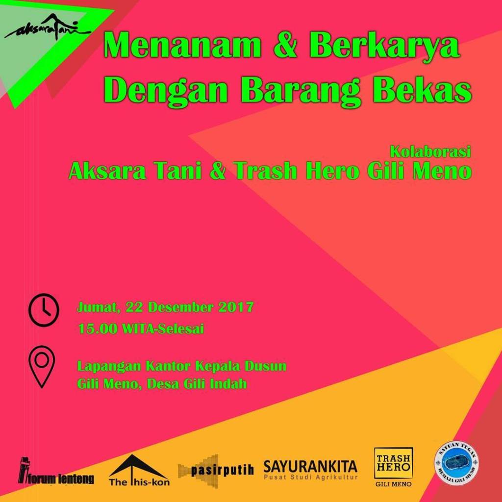 Dalam rangka memperingati Hari Ibu, 22 Desember 2017, Aksara Tani akan berkolaborasi dengan Trash Hero dan anak-anak Gili Meno untuk merespon barang-barang bekas, menjadikannya karya-karya bernilai, juga untuk mengapresiasi kehebatan kaum ibu dan menjaga pulau agar tetap hijau dengan menanam!