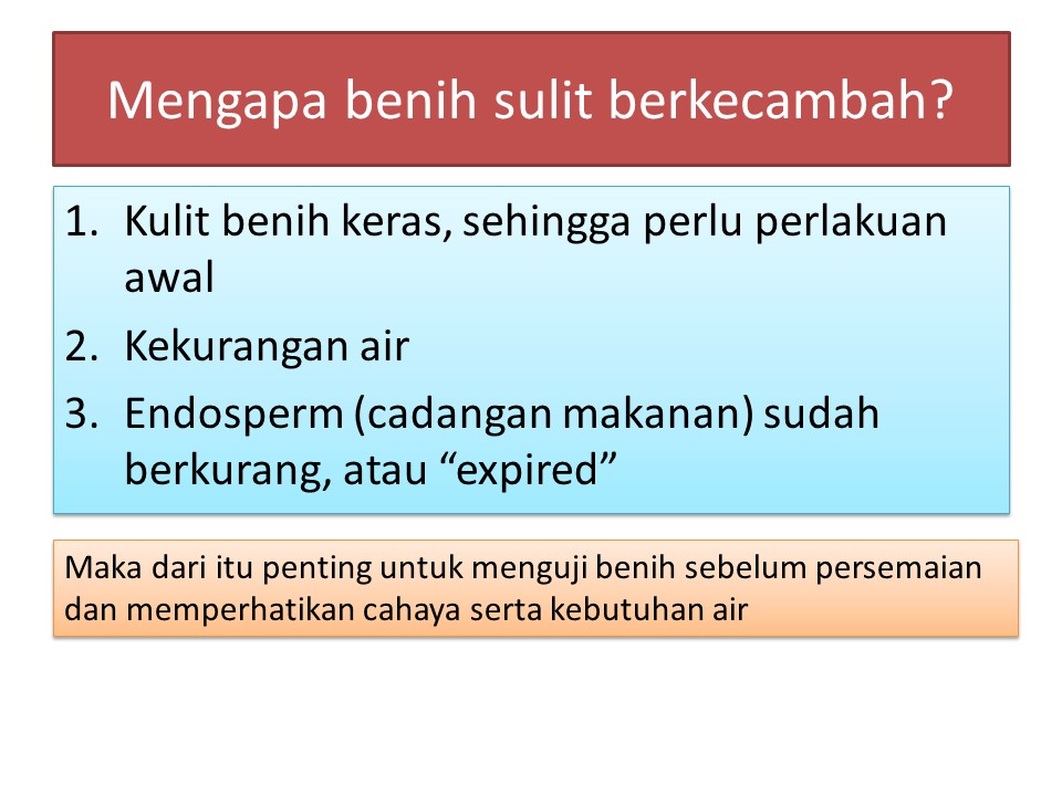 Atau kemungkinan lain, benihnya busuk. Benih busuk ini bisa jadi karena media semai yang kurang baik, baik itu porositas atau aerasinya. Jadi benih tergenang air cukup lama, sehingga tidak bisa bekerja dengan baik, dan akhirnya mati.
