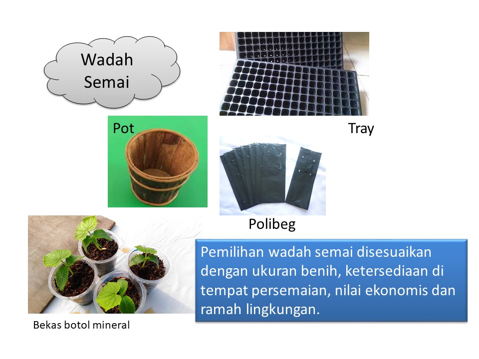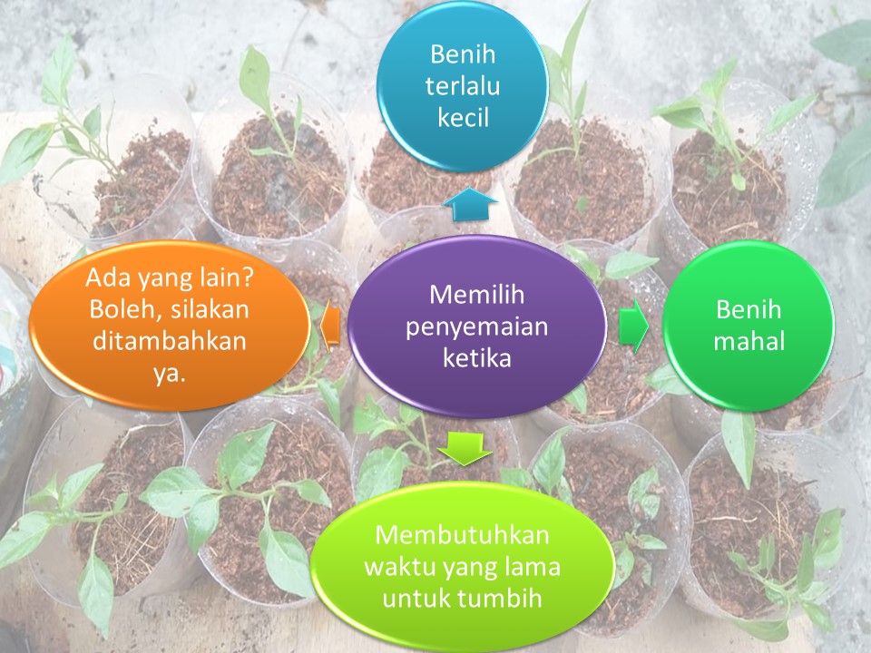 Kita bisa memproyeksikan ke segi ekonomisnya. Lebih murah menyemai banyak benih dalam satu pot. Namun, jika melihat mana yang lebih baik, ya satu wadah, satu biji.  Hal ini terkait dengan pertumbuhan akar yang tidak akan saling silang jika satu wadah saytu biji. Saat pindah tanam pun akan lebih mudah.