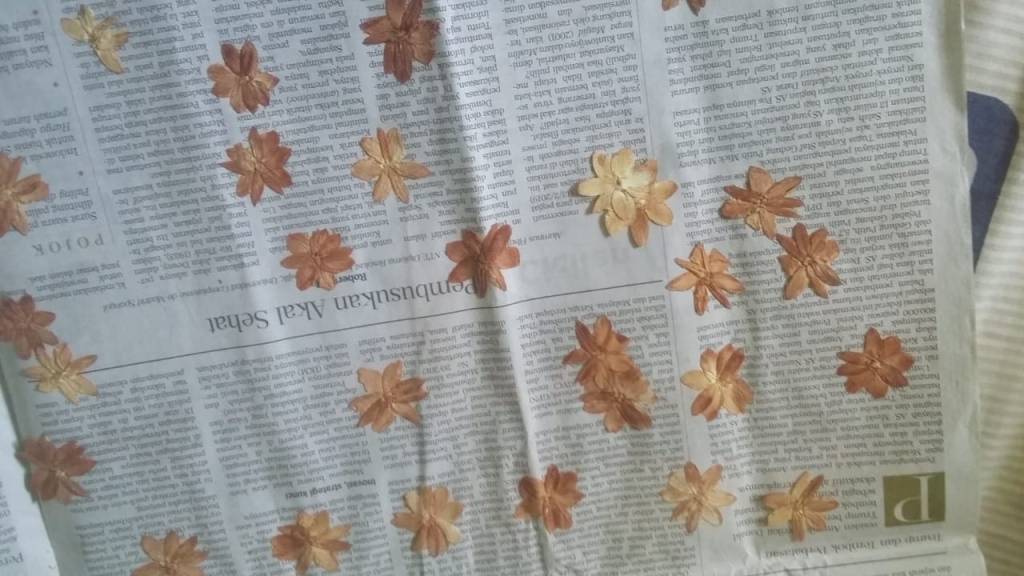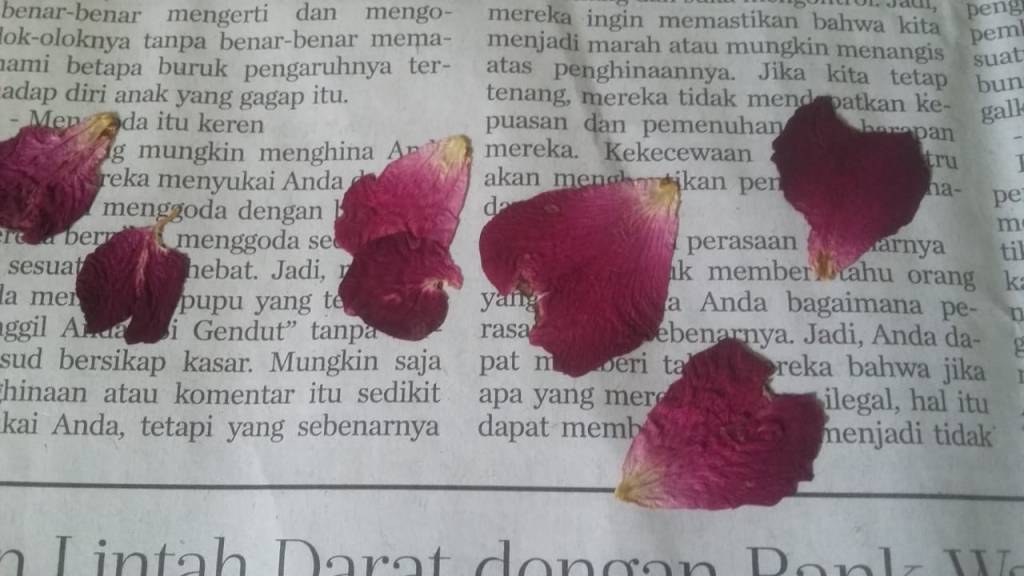 Dari penjelasan Afifah, aku baru mengetahui apa yang disebut Oshibana. Selama ini aku hanya tahu oshibana sebagai pekerjaan seni yang melelahkan, karena menyusun bunga-bunga kering yang ukurannya bisa sangat kecil dan halus. Aku juga sudah tahu bahwa oshibana berasal dari Jepang. Namun, secara deskriptif, Afifah menyebutkan bahwa oshibana merupakan seni merangkai bunga pres. Disebut “bunga pres” karena dalam proses pembuatannya dilakukan pengepresan untuk menghilangkan kadar air pada bunga-bunga. Tujuan menghilangkan kadar air ini adalah untuk membuat bunga tersebut kering sempurna sehingga dapat bertahan lama (tidak membusuk).