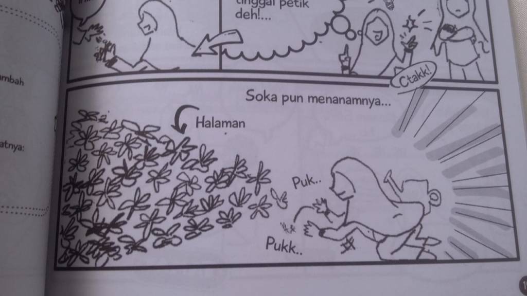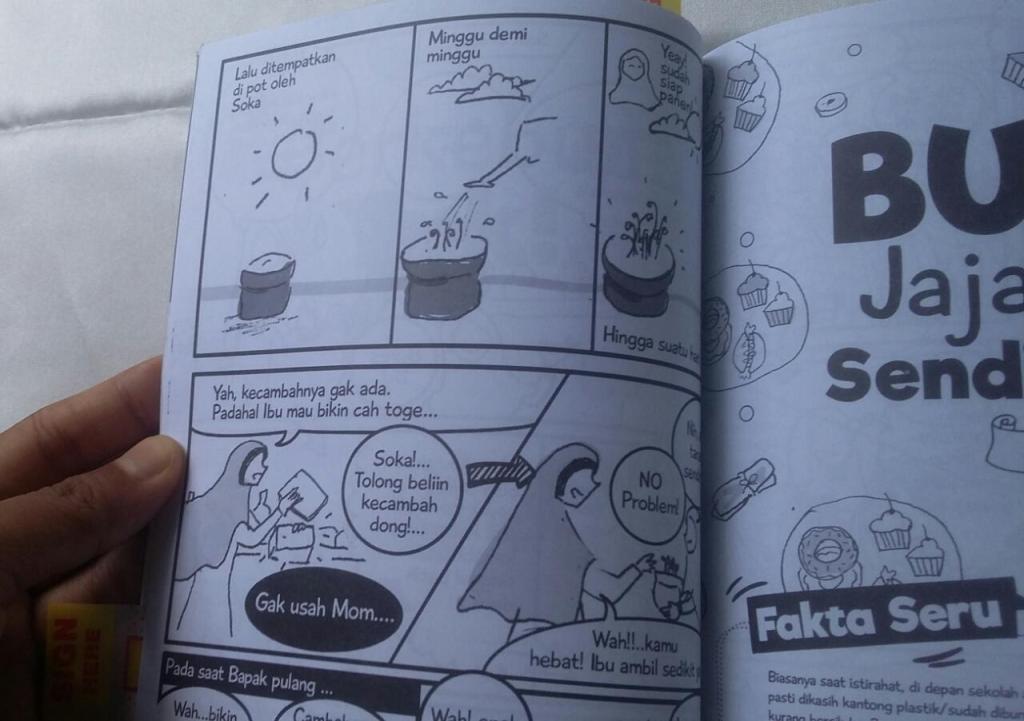 Yang menarik dari buku ini adalah pengenalan tokoh cerita (sepertinya, bagian pengenalan tokoh ini memang ciri khas sebuah komik), yang mengingatkanku pada gambaran keluarga Keni sendiri. Tokoh adalah keluarga yang sedang menerapkan gaya hidup minim sampah. Terdiri dari Mommy (di lain waktu bisa dipanggil Ibu), Bapak, Soka dan saudara kembarnya, Jati. Menurutku, Soka dan Jati berperan sebagai tokoh yang mengendalikan jalan cerita, sementara Mommy adalah tokoh yang memberikan informasi dan tips minim sampah. Lalu Bapak? Ia adalah tokoh yang biasa kita sebut “tokoh sampingan”. Perannya tidak begitu tampak dan sangat jarang muncul.